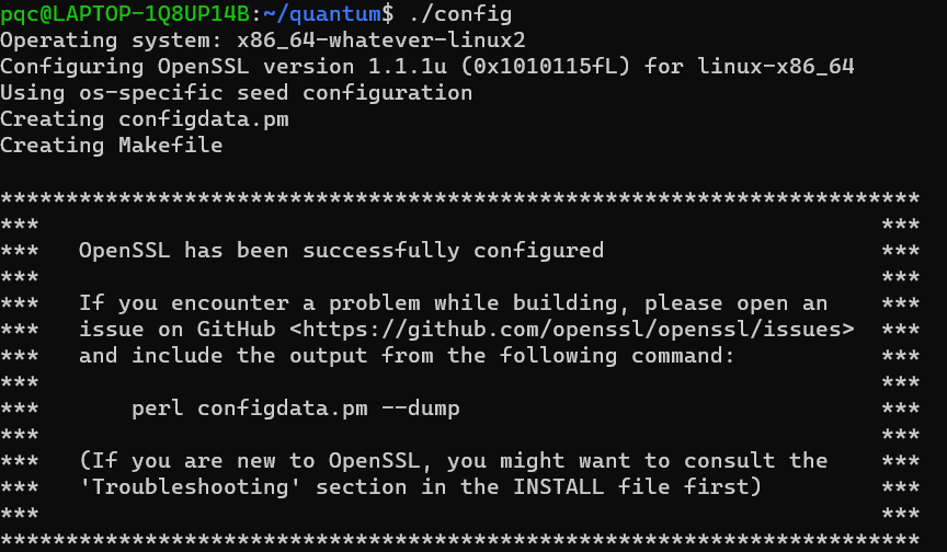 아까 liboqs 빌드 과정과 똑같다. 단지 달라진 것은 설치할 위치 옵션이 따로 생겼다는 것인데 이번 <OPENSSL_DIR> 에 는 반드시 본인이 설정한 디렉터리의 위치 + 이름을 넣어줘야 한다. 나는 quantum이었다.