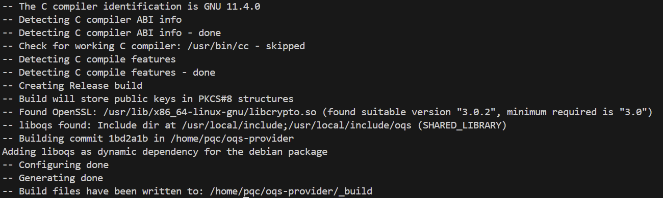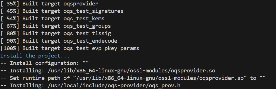 참고로 liboqs 설치 시 ninja install을 해주는 게 편하다. oqs-provider의 main CMakeLists.txt에서 find_package(liboqs REQUIRED)라는 줄이 있는데 이게 있어서 미리 설정된 경로에 필요한 파일을 알아서 찾아준다. 아니면 따로 경로 지정을 해주던가 경로지정 파일을 만들어야 하는 귀찮음이 발생할 수 있다.